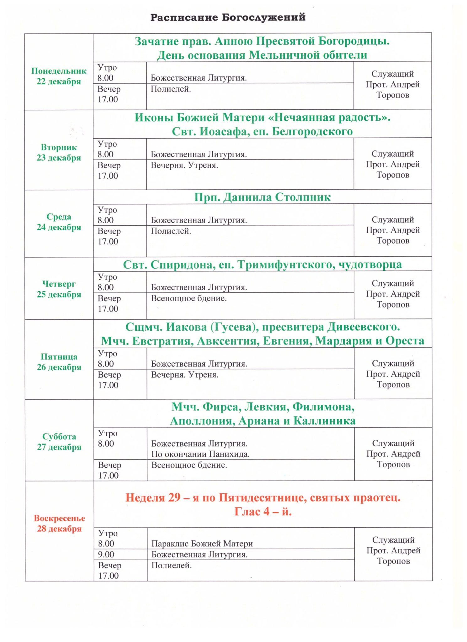 - 22 декабря 20259 декабря 2025 (по ст.ст.)ПонедельникСедмица 29-я по ПятидесятницеИкона Богородицы «Нечаянная Радость» Святитель Софроний, архиепископ КипрскийПреподобный Стефан Новосиятель, КонстантинопольскийСвященномученик Владимир, пресвитер, мученица Евфросиния ДжуринскиеСвященномученики Василий Ягодин и Александр Буравцев, пресвитерыПророчица Анна, мать пророка СамуилаСвященномученик Владимир Виноградов, пресвитерСвященномученик Александр Буравцев, пресвитерПраведная Анна, мать Пресвятой БогородицыСвященномученик Василий Ягодин, пресвитерСвященномученик Владимир Джуринский, пресвитерМученица Евфросиния ДжуринскаяЕвр.3:5–11,17–19, Мк.8:11–21, Гал.4:22–31, Лк.8:16–21