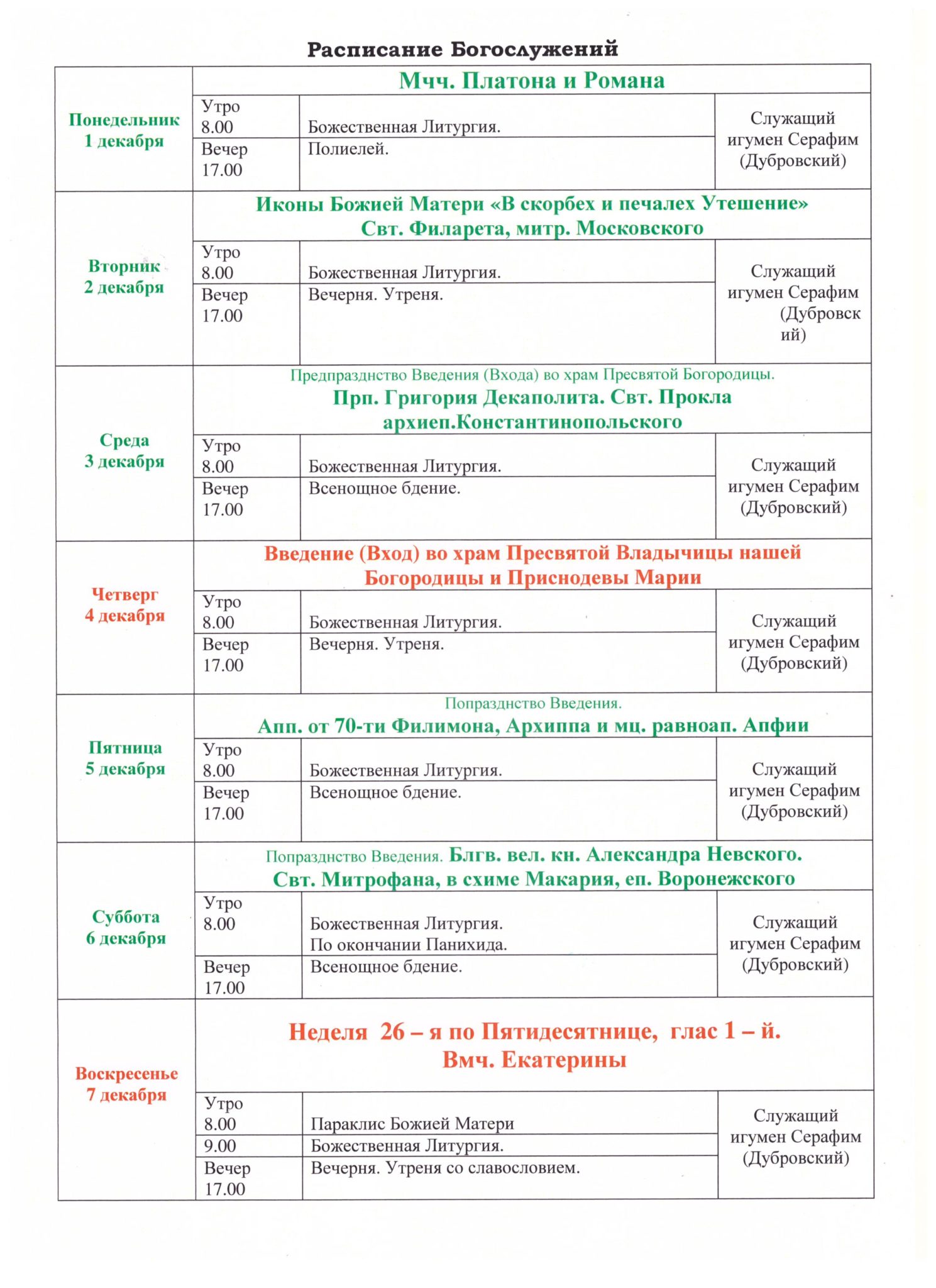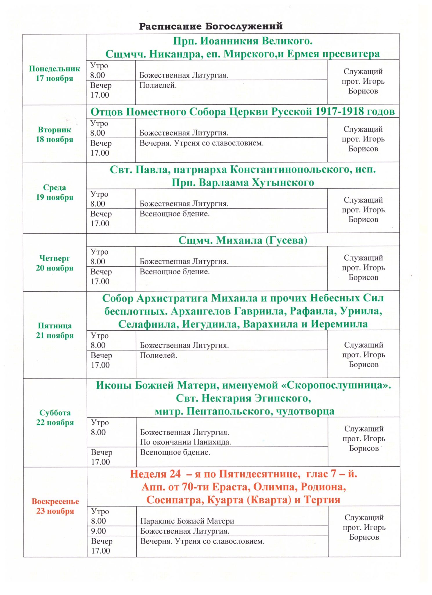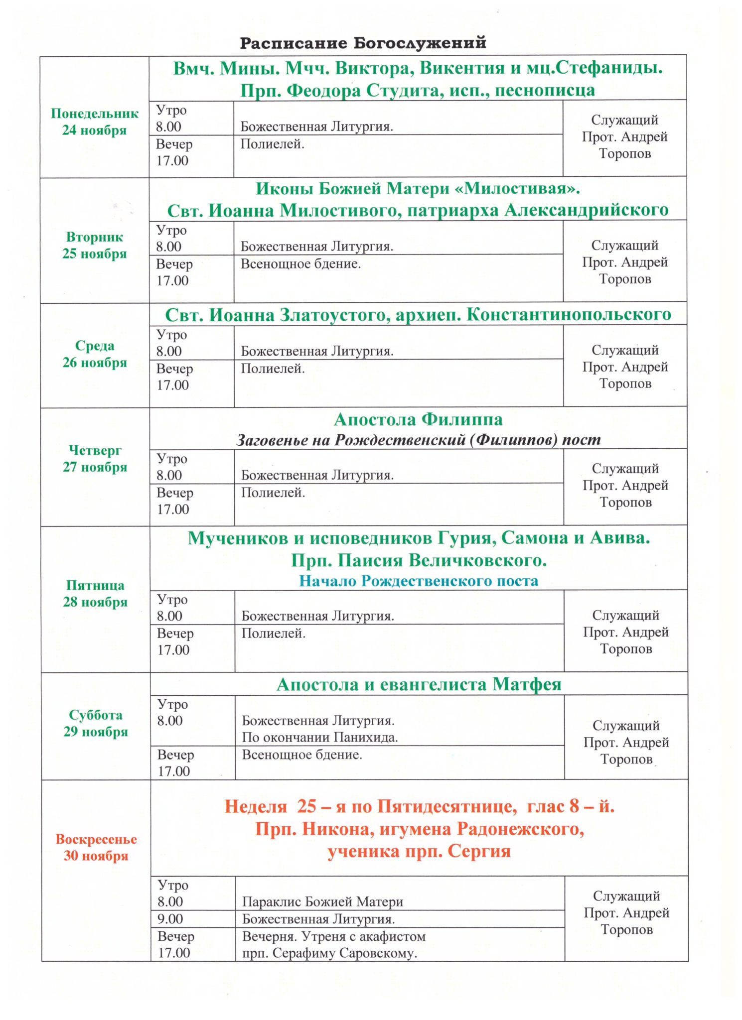- 30 ноября 202517 ноября 2025 (по ст.ст.)ВоскресеньеНеделя 25-я по ПятидесятницеИкона Богородицы «Елеоточивая» («Элеовритисса») Мученик Ацискл и мученица Виктория КордувийскиеСвятитель Григорий Чудотворец, епископ НеокесарийскийПреподобный Никон Радонежский, игуменПреподобный Лазарь Константинопольский, иконописец, иеромонахМученик Гоброн (в Крещении Михаил) Кахетинский, князьПреподобный Севастиан Джексонский, архимандритМученик Ацискл КордувийскийМученица Виктория КордувийскаяМк.16:9–20, Еф.4:1–6, Лк.12:16–21, 1Кор.12:7–11, Мф.10:1,5–8, Гал.5:22–6:2, Мф.4:25–5:12